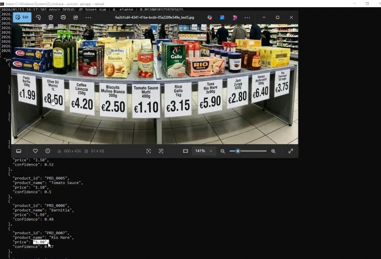 The extracted information is converted into structured JSON output, including product names, prices, weights, and other label attributes. The output includes built-in validation and error handling for incomplete or unreadable data.